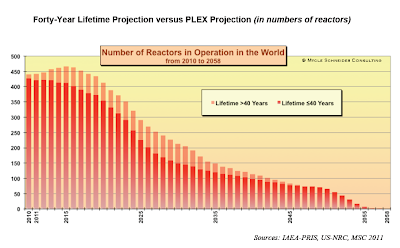 En el informe “The World Nuclear Industry Status Report 2004”, la edad media era de 21 años. En el informe “The World Nuclear Industry Status Report 2007”, la edad media era de 23. Y en el informe “The World Nuclear Industry Status Report 2009”, era de 25. Es decir que el parque mundial, sigue envejeciendo un poco cada año. Otra causa más de esto, es que la edad de cierre de cada reactor es de 22 años de media, algo menos que la edad media global. Puede que en el informe que se haga dentro de 5 años, tengamos una edad media cercana a los 30 años. Y esto no es una proclama antinuclear. Es sencillamente la conjunción de tres elementos inamovibles: construcciones históricas, cierres históricos, y matemática elemental.