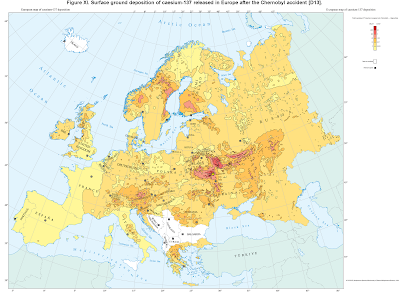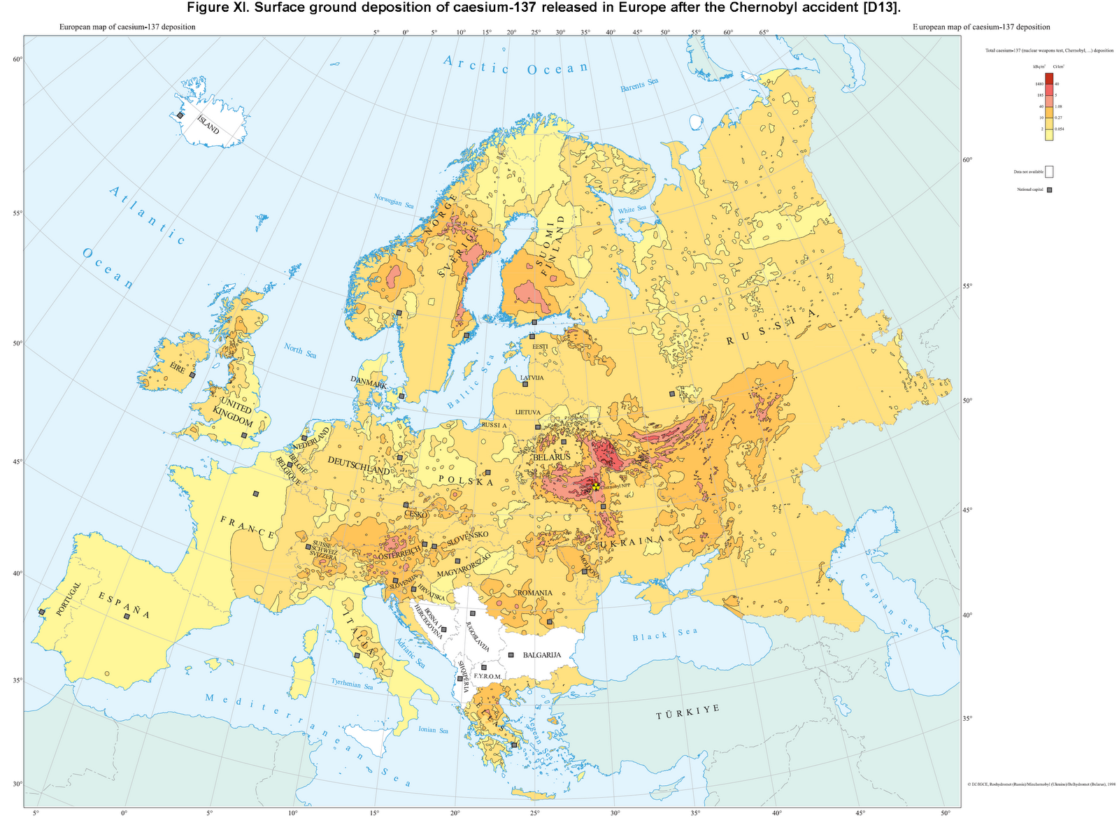 Sin embargo el isótopo Cesio-137 se depositó por toda Europa, en mayor o menor medida. Tiene un tiempo de desintegración de 30 años, y es especialmente peligroso por que el cuerpo humano lo confunde con Potasio, y se acumula en los músculos
